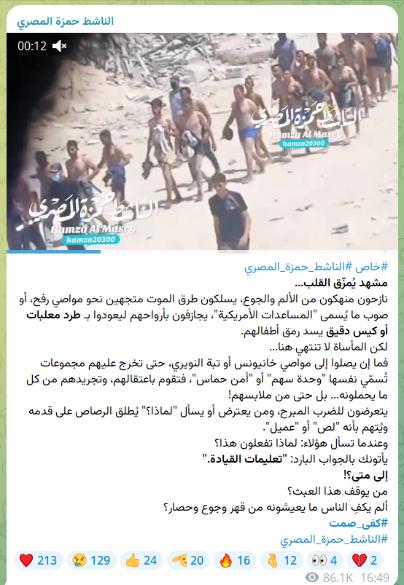Volgens al-Masri spelen deze beelden zich af in de wijk Mawasi, dicht bij de stad Khan Younis, in het zuiden van de Gazastrook. De burgers zouden terugkomen van een voedselbedeling van de Gaza Humanitarian Foundation.