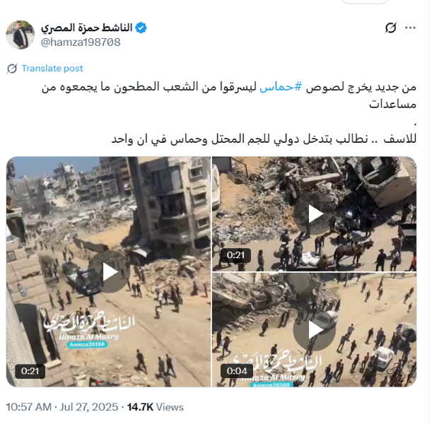 “Gewapende Hamas-groepen arresteren Palestijnen die voedsel afhalen bij de GHF, beroven hen van al hun bezittingen – zelfs hun kleding – en mishandelen hen ernstig.” Dit en gelijkaardige berichten worden gedeeld op sociale media, zoals de Nederlandse organisatie Joods.nl en de Vlaamse filosoof Maarten Boudry op hun X-kanaal.