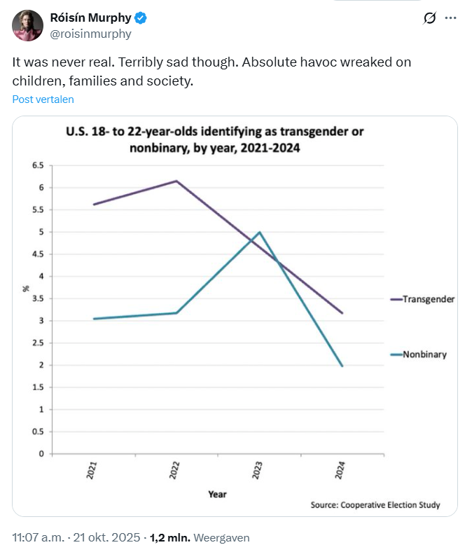 Volgens die grafiek daalde het aandeel transgenderpersonen in deze leeftijdsgroep tussen 2022 en 2024 van ongeveer 6% naar iets meer dan 3%, terwijl het aandeel non-binaire personen tussen 2023 en 2024 daalde van 5% naar 2%.