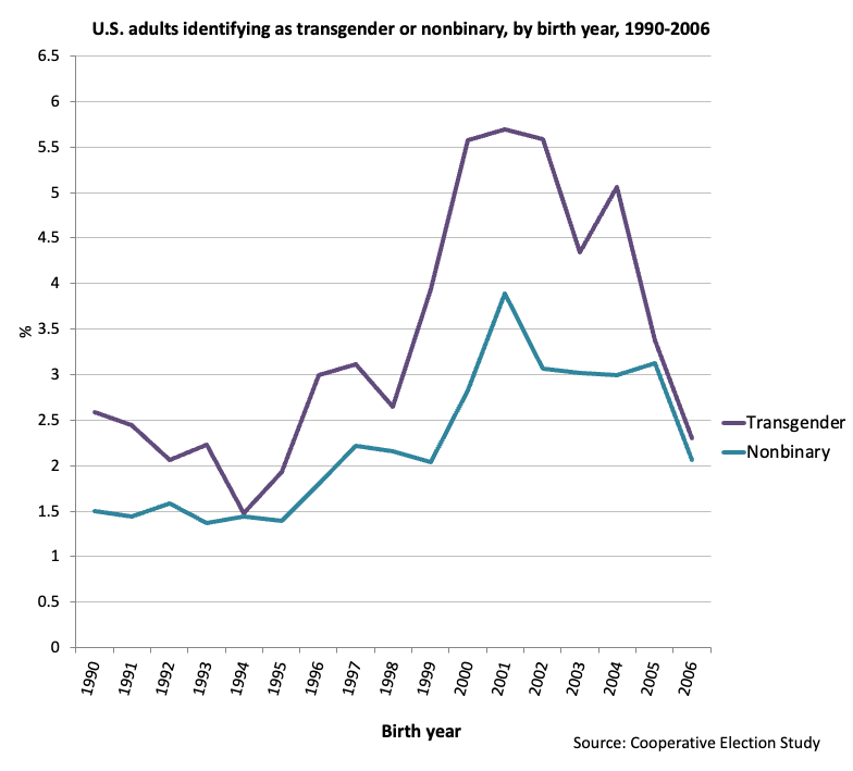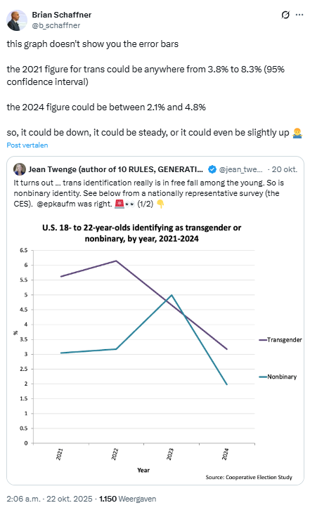 “Deze grafiek toont de foutenmarge niet”, schrijft hij. “Het cijfer voor transgender voor 2021 kan variëren van 3,8 procent tot 8,3 procent (95 procent betrouwbaarheidsinterval). Het cijfer voor 2024 kan variëren van 2,1 procent tot 4,8 procent.”