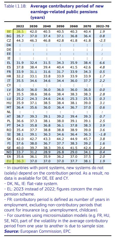 Kim De Witte probeerde de bewering van Axel Ronse te ontkrachten op basis van cijfers uit het Ageing Report van de Europese Commissie. De tabel die hij deelt beschrijft de lengte van een loopbaan van nieuwe gepensioneerden, die wordt gebruikt om het pensioen te berekenen. In 2022 zou dat voor België 38,5 jaar zijn, ruim twee jaar langer dan het Europese gemiddelde.