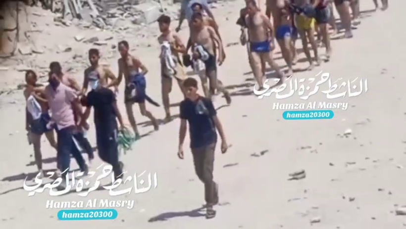 Op 21 juli deelt de Palestijnse activist en journalist Hamza al-Masri een schokkende video op X en Telegram. De beelden tonen hoe een twintigtal mannen, ontkleed tot op hun onderbroek, in een rij wandelen. Ze zijn vergezeld door een zestal geklede mannen, van wie één een kettingzaag vasthoudt.
