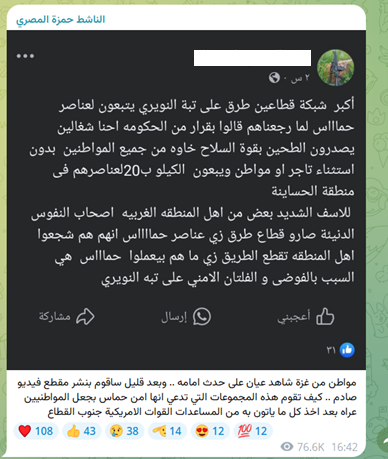 De Arabische tekst in de screenshot gaat over voedselbedelingen in Al-Furkhia, een stad ten zuiden van Khan Younis. Vervolgens staat er dat “sommige mensen bandieten zijn geworden” en dat “zij de mensen van Al-Furkhia hebben aangemoedigd om de weg te versperren en te doen wat ze doen.”