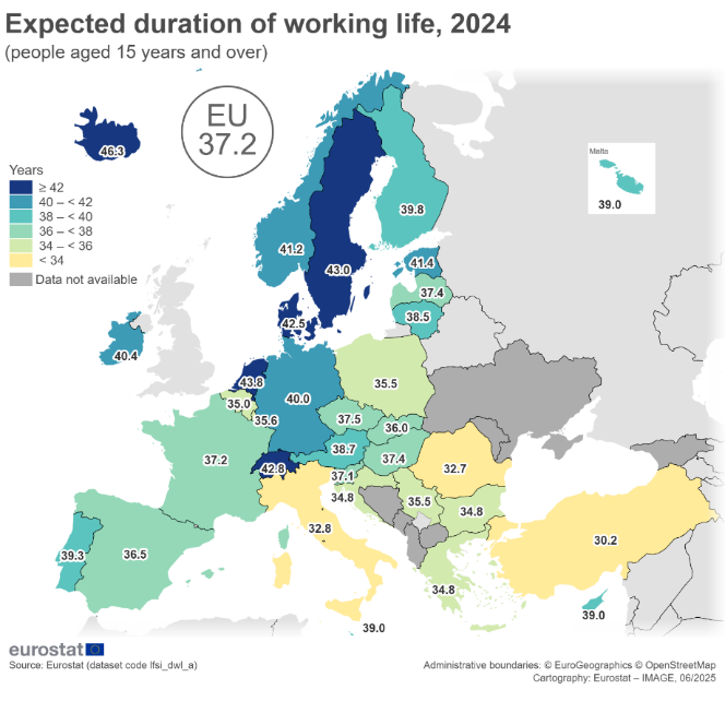 Verwachte loopbaanduur in 2024. Bron: Eurostat.